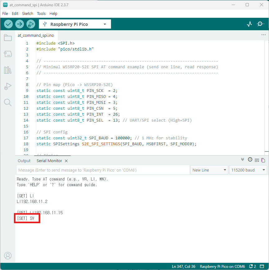 Example for configuring W55RP20-S2E by sending commands entered through USB serial from Pico via (UART/SPI)