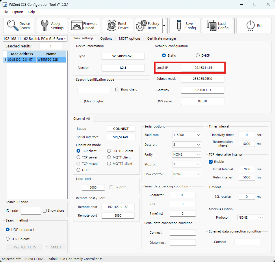 When you perform a search using the WIZnet Config Tool, you can confirm that the Local IP address of the W55RP20 S2E has been changed.
