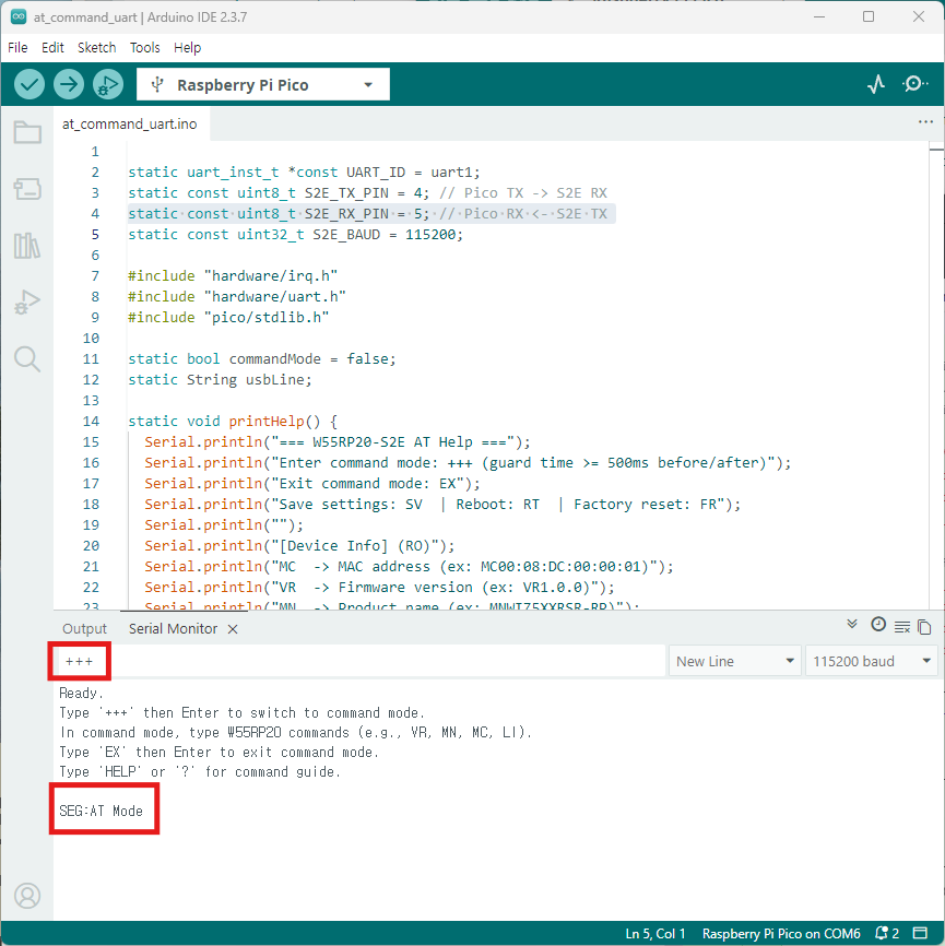Enter '+++' to send the command to the W55RP20 S2E to enter AT mode.