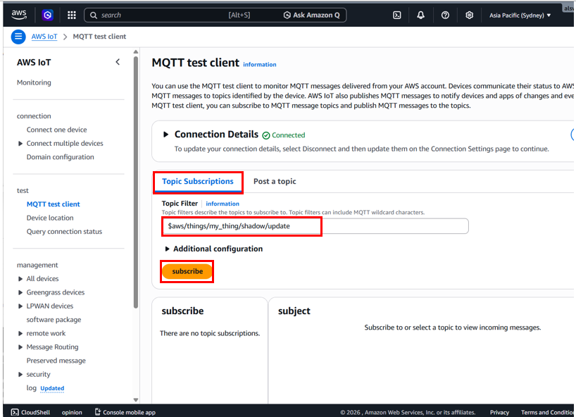 2. Using the AWS IoT console, subscribe to the specified topic. Then publish a test message to the another specified topic.