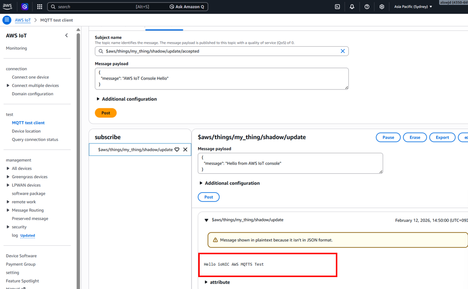 4. The W55RP20-S2E publishes the response message received via UART to the configured topic in AWS IoT Core.