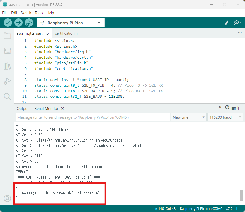 3. The W55RP20-S2E receives the message from the subscribed topic via AWS IoT Core and forwards it to the Raspberry Pi Pico through the UART interface.