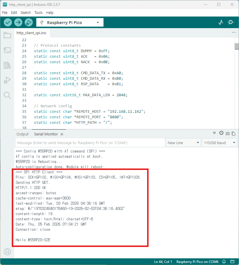 This example demonstrates how the Raspberry Pi Pico transmits AT commands to the W55RP20 S2E board via UART or SPI to configure it as a HTTP Client(TCP Client) device.