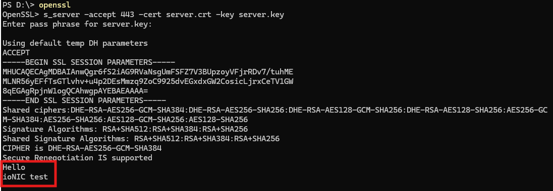 > s_server -accept 443 -cert server.crt -key server.key1. After the W55RP20-S2E is configured as an SSL client and the handshake with the SSL server is successfully completed, the Windows terminal displays a connection success message as shown below.