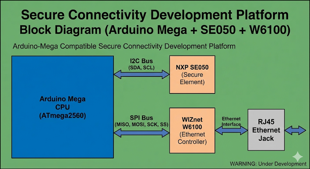 This project was initiated to provide a secure and reliable network connectivity solution for IoT development. Existing Arduino Mega-compatible boards often lack integrated security features and reliable Ethernet connectivity, forcing developers to use multiple add-on shields. This project combines secure connectivity, data logging, and industrial-grade components into a single unified platform. The primary goal is to enable developers to build secure networked applications without the complexity of integrating multiple hardware components. Specifically, the project utilizes the W6100 Ethernet controller to ensure IPv4/IPv6 dual-stack support and leverages the SE050 EdgeLock secure element for hardware-based cryptographic operations.