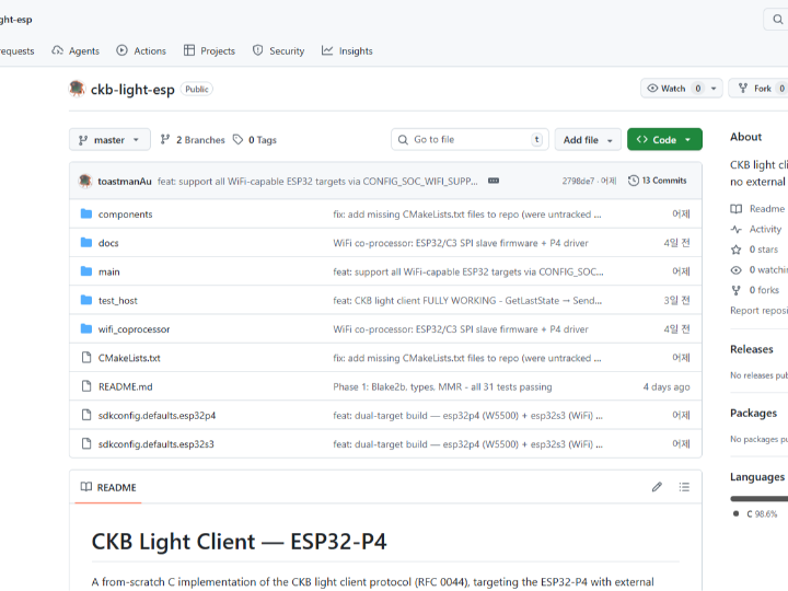 - ESP-IDF 빌드: RISC-V 바이너리로 크로스 컴파일. ESP32-P4 개발 보드에 플래시하고 CKB 테스트넷에 연결하여 라이브 검증.