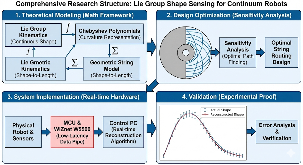 Stage 1: Theoretical Modeling (Top Left) – Designing the Mathematical "Brain" It all begins in the abstract. How do you define the shape of a robot that has no bones or joints, like an elephant's trunk? The researchers combined advanced Lie Group Kinematics with efficient mathematical tools called Chebyshev Polynomials. This creates the "mathematical brain" capable of translating simple string pulls into complex, continuous 3D shapes.