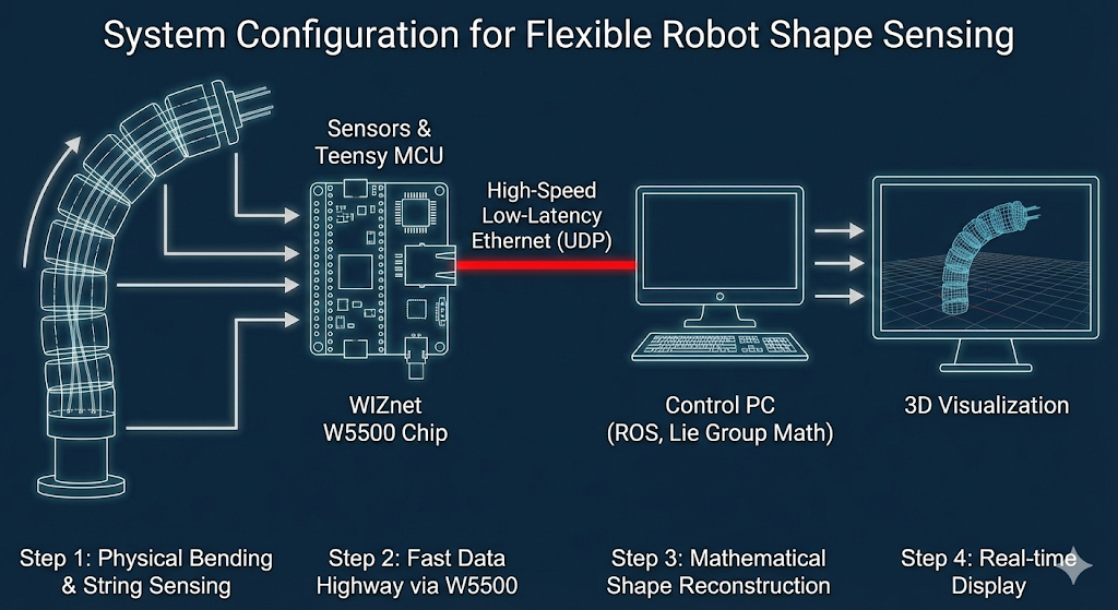 Modern continuum robots require a sophisticated mathematical brain to sense their intricate shapes without cameras, relying solely on minute changes in internal string length. For this "brain" to function in the real world, sensor data must be transmitted instantly without even a millisecond of lag. WIZnet’s W5500 provides this essential high-speed neural network, ensuring the real-time synchronization required for complex control. In this high-tech era, Ethernet is evolving into the critical infrastructure that brings advanced algorithms to life..