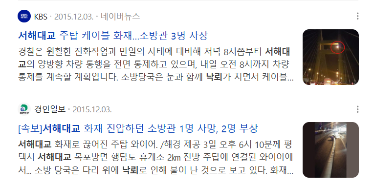 2015년 12월 3일, 서해대교에서 화재가 발생했습니다. 사고조사위원회는 낙뢰가 원인이라고 결론지었습니다. 이후 국토교통부는 유사 사고 예방을 위해 전국 케이블교에 낙뢰 전류 측정기(LCMI) 설치를 의무화했습니다.