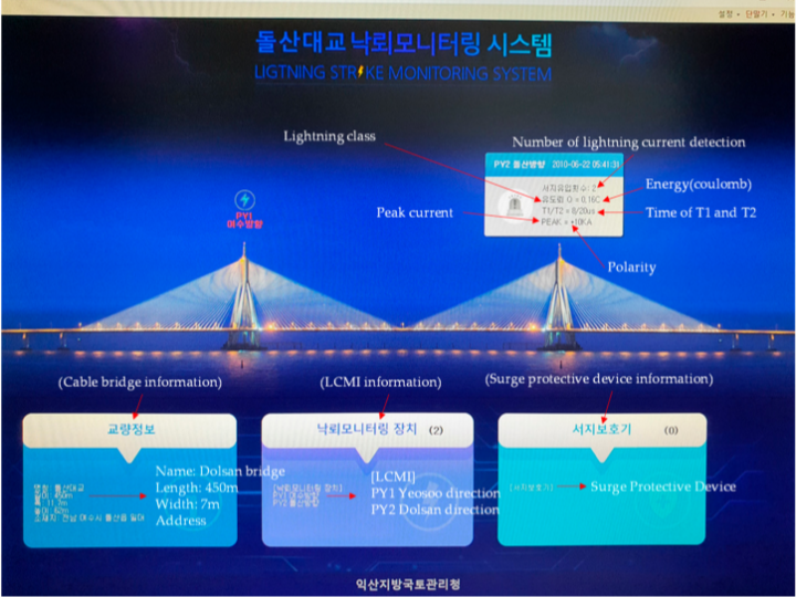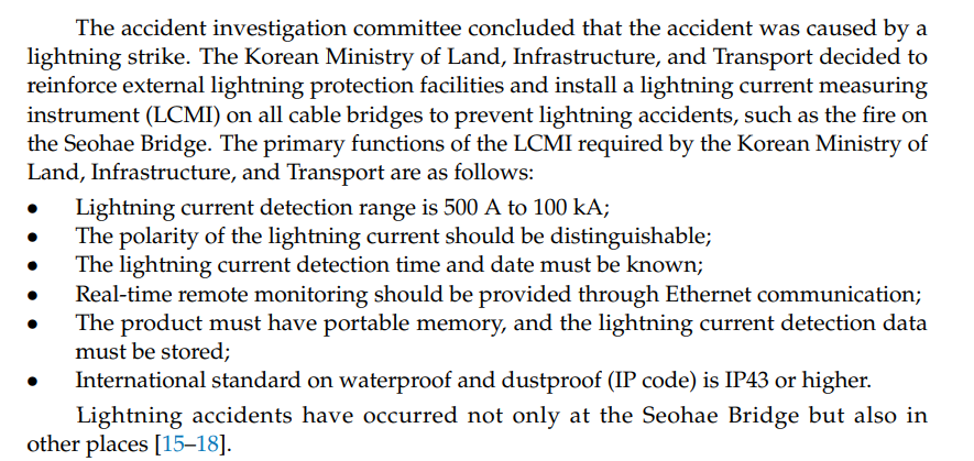 On December 3, 2015, the Seohae Bridge in Korea caught fire. The accident investigation committee concluded the cause was a lightning strike. The Korean Ministry of Land, Infrastructure, and Transport then mandated that all cable bridges be equipped with lightning current measuring instruments (LCMI) to prevent similar accidents.