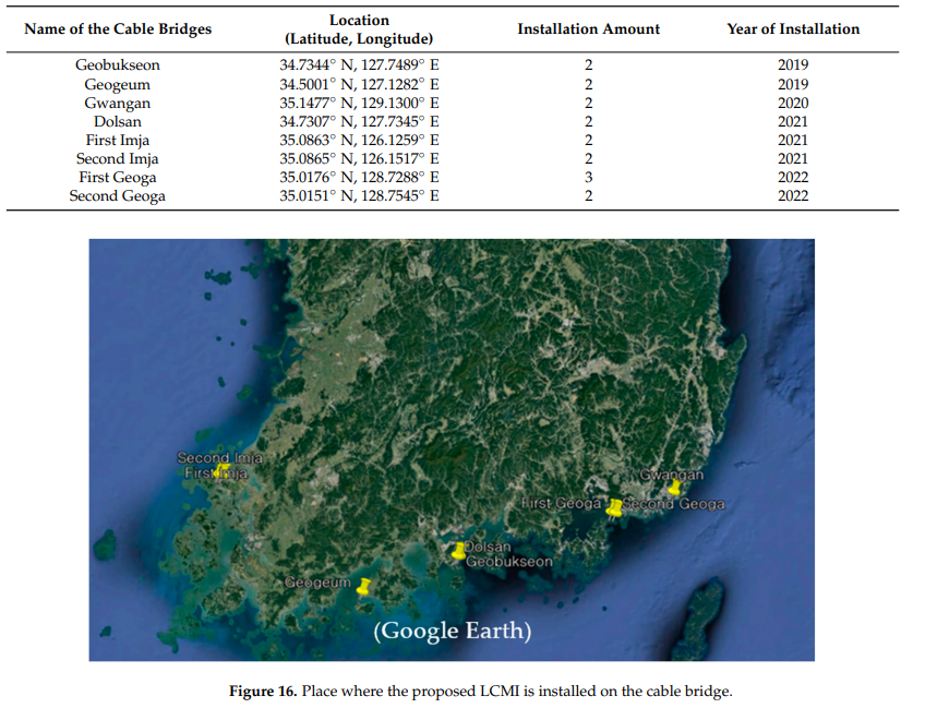 "대한민국에는 총 76개의 케이블교가 있습니다. 국토교통부는 2019년부터 2030년 사이에 56개의 케이블교에 LCMI를 적용할 계획입니다. 제안된 LCMI는 Table 11과 Figure 16에 나타난 바와 같이 8개의 케이블교에 설치되어 운영되고 있습니다."