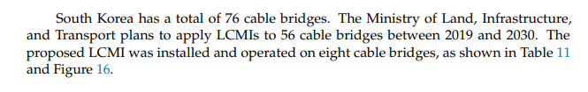 The Korean Ministry of Land plans to install LCMIs on 56 of Korea's 76 cable bridges between 2019 and 2030.