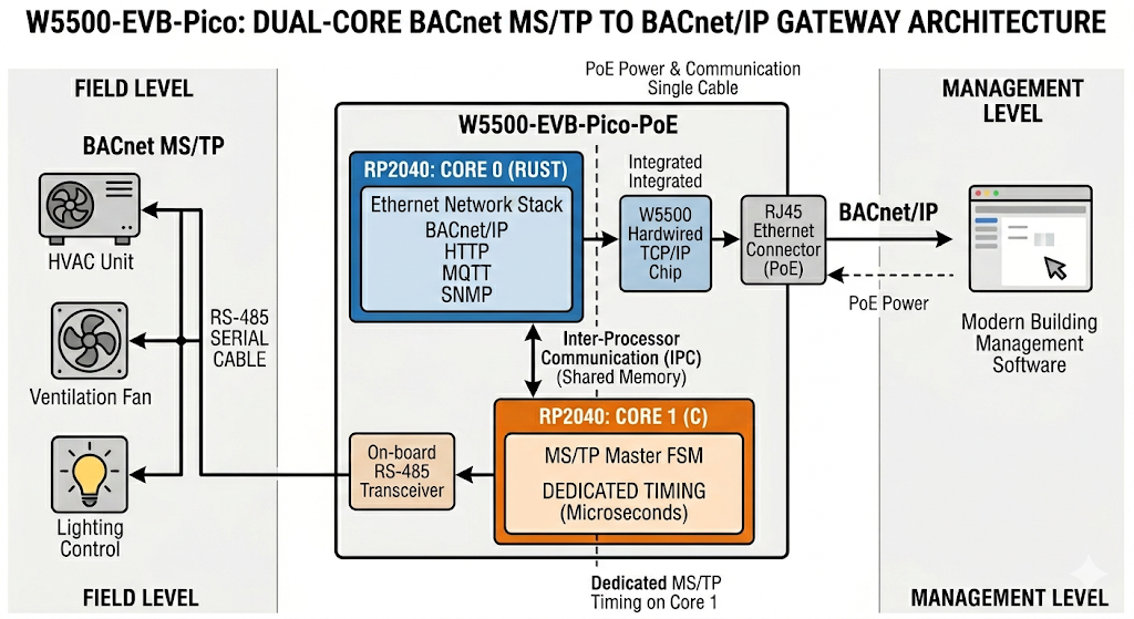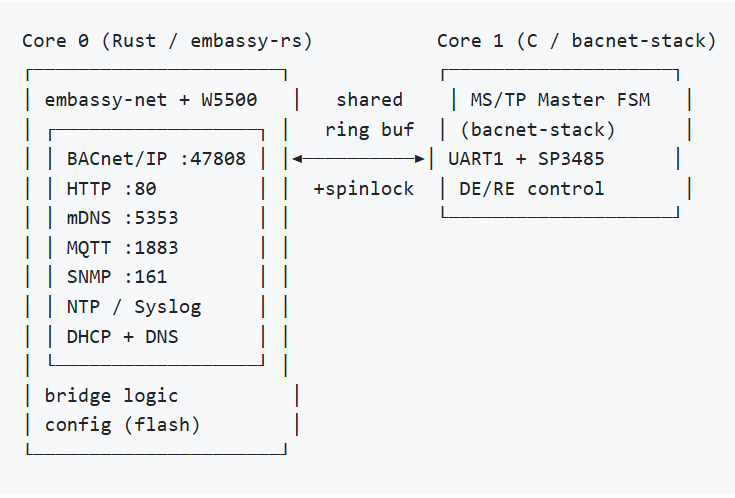 Core 0 (Rust / embassy-rs) W5500으로 BACnet/IP, HTTP, MQTT, mDNS, SNMP, NTP, Syslog를 동시에 처리합니다. 두 코어는 공유 링 버퍼와 스핀락으로 데이터를 주고받습니다.
