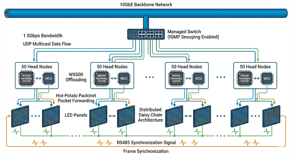Distributed Daisy Chain Architecture: Direct switch connections for 800 panels create hardware port constraints and network complexity issues. To address this, we adopted a PIO (Programmable I/O) based packet forwarding approach implementing a "hot-potato" transmission technique. Each node operates by forwarding packets to the next node simultaneously while receiving, dramatically reducing the required switch ports from 800 to approximately 50, thereby cutting network infrastructure costs.