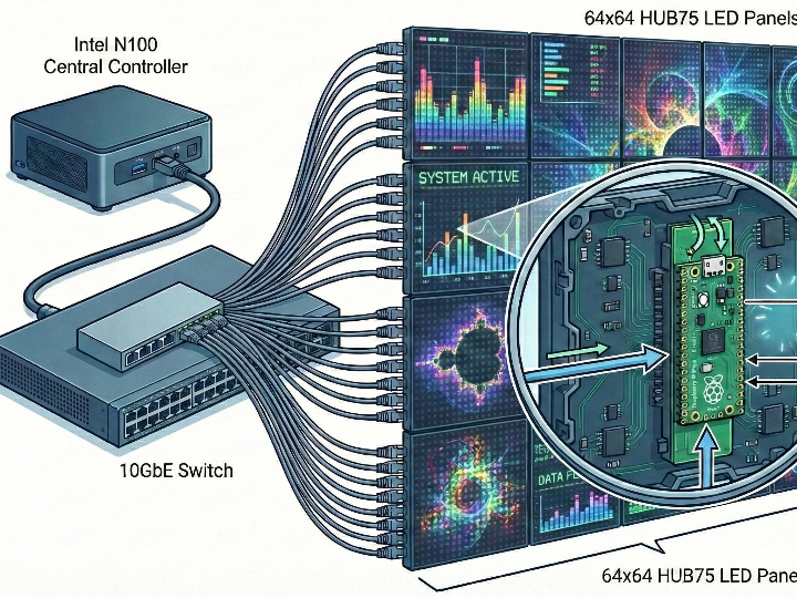 Intel N100 PC sends video to 800 LED panels via 10GbE. Each panel has a Pico controller. Zero-copy code ensures real-time sync on the 20m2 display wall.