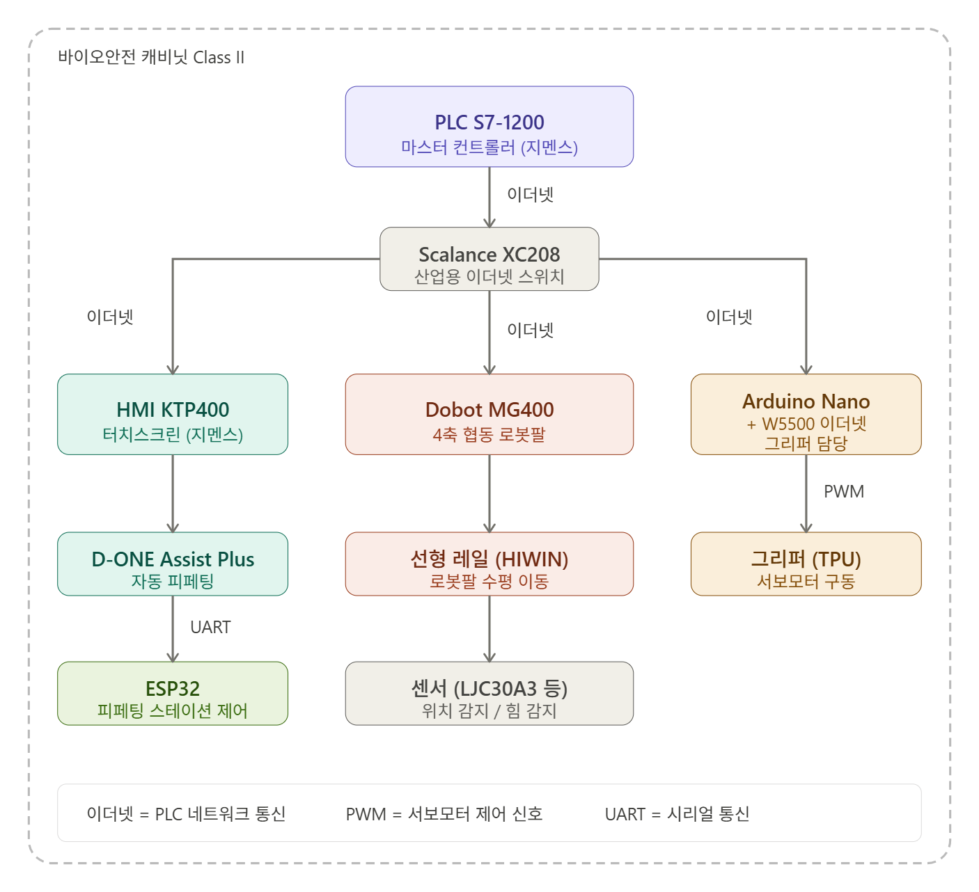 이 시스템은 계층적 제어 구조를 가집니다. Siemens S7-1200 PLC가 마스터 컨트롤러로 전체 공정을 제어하고, Arduino Nano와 ESP32가 각 서브시스템(그리퍼, 피페팅 스테이션)을 담당하는 슬레이브로 동작합니다.