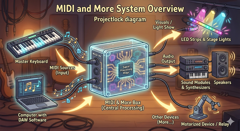 이 프로젝트의 핵심인 **MIDI(Musical Instrument Digital Interface)**는 전자 악기, 컴퓨터, 조명 장비 등이 서로 소통하기 위해 만들어진 세계 공통의 디지털 언어입니다.