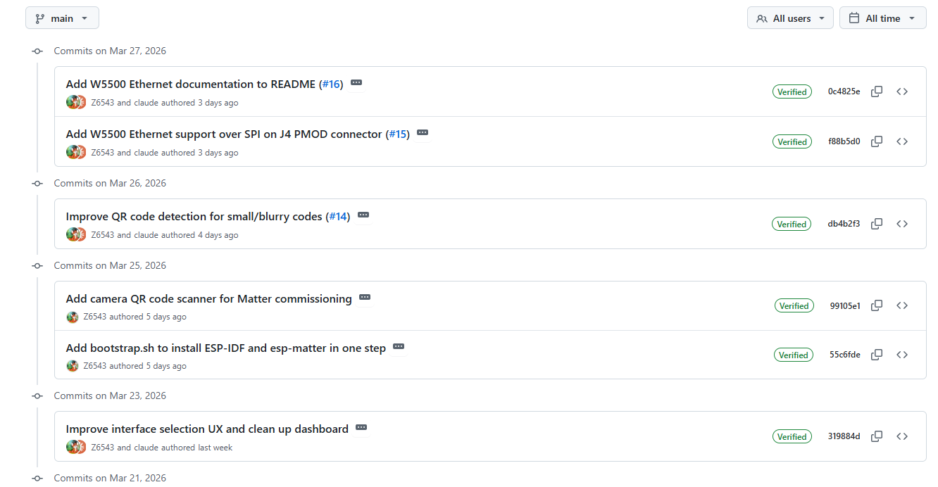 Tanmatsu 하드웨어 — ESP32-P4, 디스플레이, 카메라, 키보드 — 는 독립형 Matter 커미셔너를 만들기 위한 모든 것을 제공합니다. 이 프로젝트는 정확히 그것을 구현했습니다: PIN, QR 코드, BLE, Thread 방식으로 인증된 Matter 기기를 커미셔닝하고, 기기 자체의 대시보드에서 제어합니다.