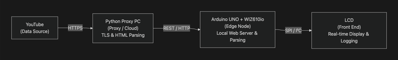 Python Proxy (PC or Raspberry Pi) – fetches the YouTube page via HTTPS, extracts the subscriber count, and sends a simple HTTP GET request to the UNO.