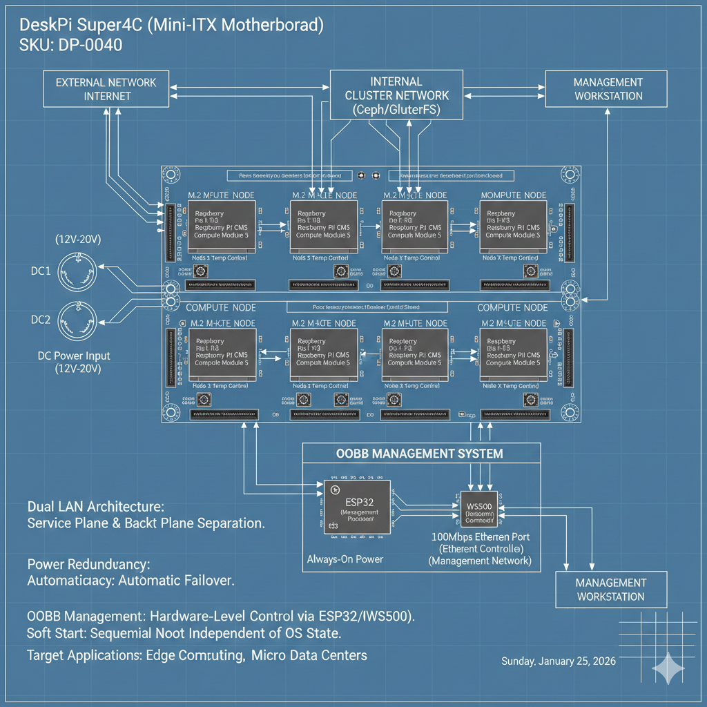 **DeskPi Super4C (SKU: DP-0040)**는 표준 Mini-ITX 폼팩터 내에 4개의 **Raspberry Pi CM5 (Compute Module 5)**를 집적한 고성능 클러스터 보드입니다. 단순한 I/O 확장을 넘어, 전원 이중화(Redundancy), 대역폭 분리(Dual LAN), 그리고 OOB(Out-of-Band) 관리 기술을 도입하여 데이터 센터 수준의 운영 안정성을 제공하는 것을 목표로 합니다.