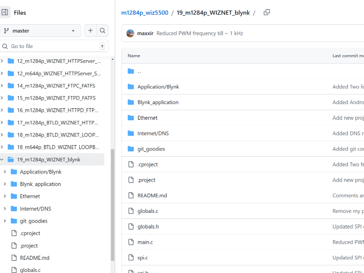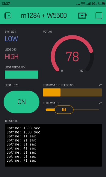 이 프로젝트는 ATmega1284P(8-bit AVR) + WIZnet W5500 Ethernet 조합으로, Blynk 클라우드에 연결되는 유선 이더넷 IoT 노드를 구현한 예제입니다. 사용자는 스마트폰 Blynk 앱에서 버튼/슬라이더/게이지를 통해 LED·릴레이 제어 및 센서 모니터링을 간단히 할 수 있습니다.