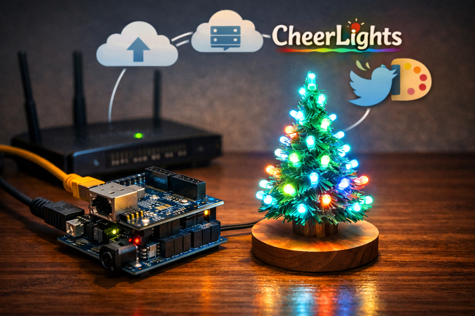 The CheerLights Desktop Christmas Tree is a compact yet powerful demonstration of what happens when you combine: