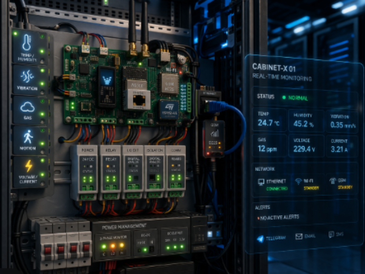 센서, 통신, 제어 기능을 캐비닛 내부 보드에 통합하여 관리하며, 외부 센서는 RS485 네트워크로 분리하여 확장성과 유지보수성을 확보하였다.