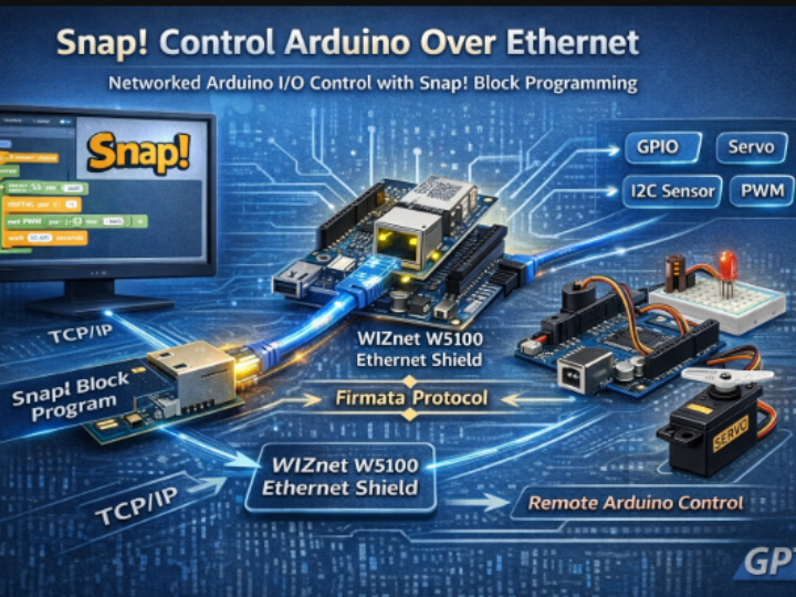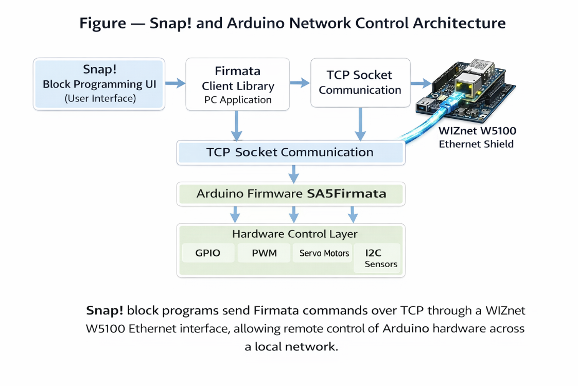 SA5 (Snap! and Arduino Synchronized) connects the Snap! block-programming environment with Arduino hardware using the Firmata protocol. By using a WIZnet W5100 Ethernet shield, Firmata communication can run over TCP instead of serial, enabling remote control of Arduino GPIO, PWM, servo motors, and I2C sensors across a local network.