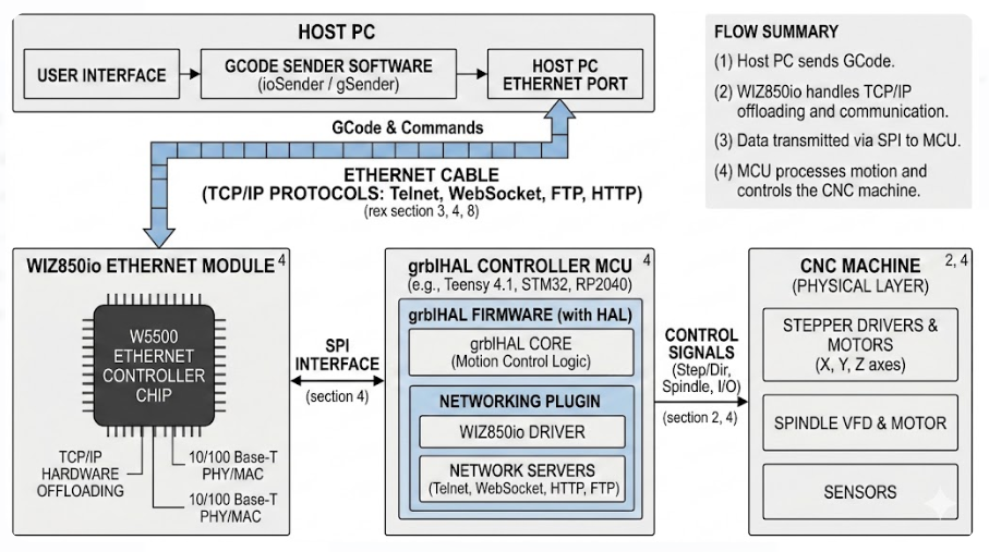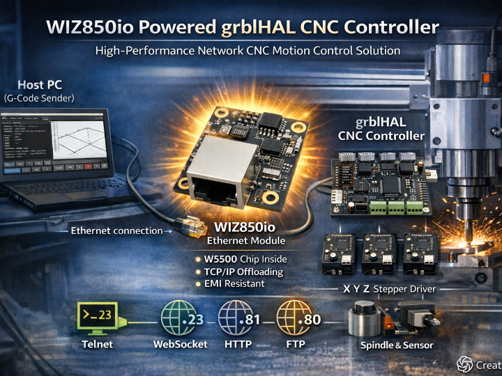 WIZ850io enables stable Ethernet connectivity for grblHAL CNC controllers by offloading TCP/IP to W5500 hardware, ensuring deterministic motion control.