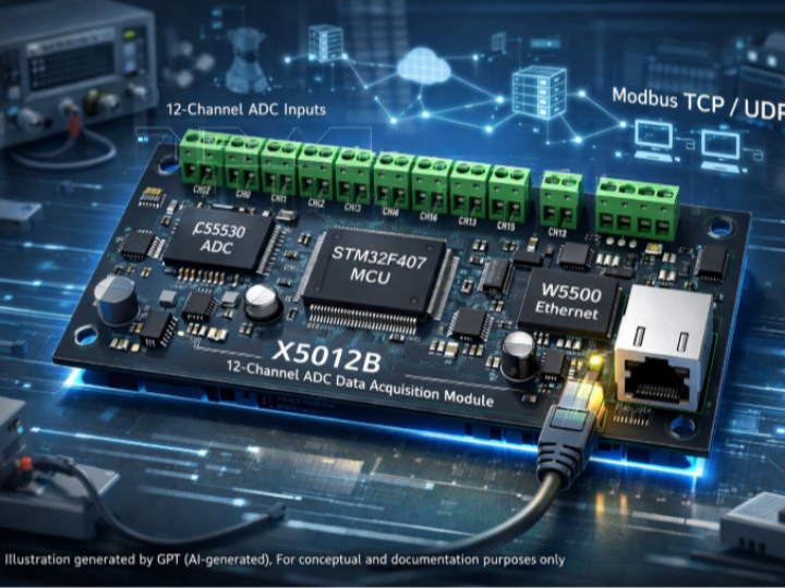 At the firmware level, it integrates FreeRTOS, a Modbus TCP stack, and a custom UDP command protocol, turning the board into a standalone Ethernet-based data acquisition node rather than a simple MCU peripheral.