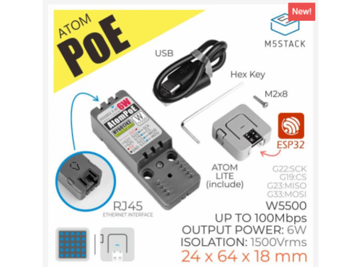 The M5Stack Atom PoE is a kit consisting of two parts: An ethernet module that supports Power over Ethernet (PoE) and an M5Stack Atom Lite.