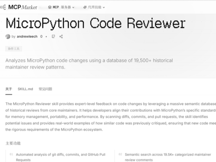 This tool is an AI skill plugin specifically designed for code review of MicroPython , based on the review comments of over 19,500 historical maintainers in the MicroPython community, helping you check for MicroPython-specific issues such as memory management, portability, and performance, and supporting AI agents like Claude and ChatGPT.