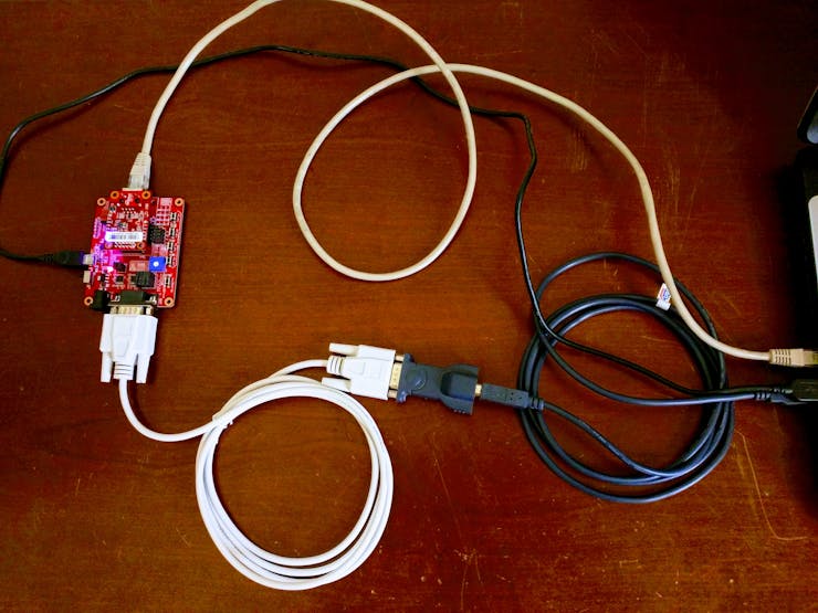 - Serial cable, from the evaluation board's serial port to your PC's serial port. You need to get an RS-232 to USB converter separately if your PC doesn't have one like mine.