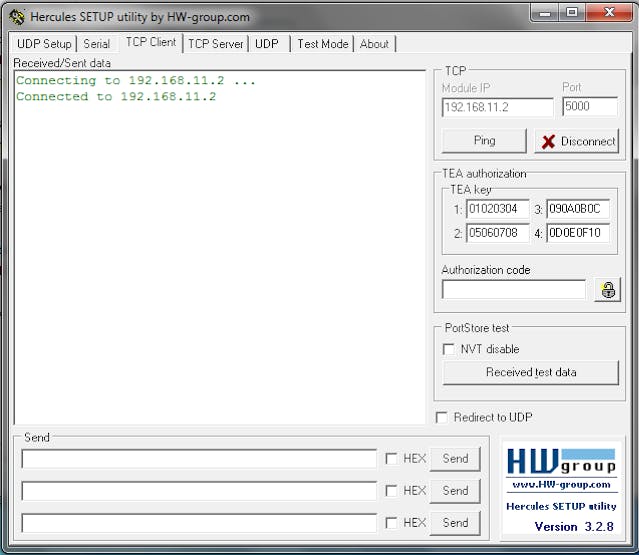 Open the program Hercules, downloaded earlier, and go to the TCP client section. Enter the default IP address of the WIZ750SR as well as the default port, which should be 192.168.11.2 and 5000 respectively, and then click "Connect".