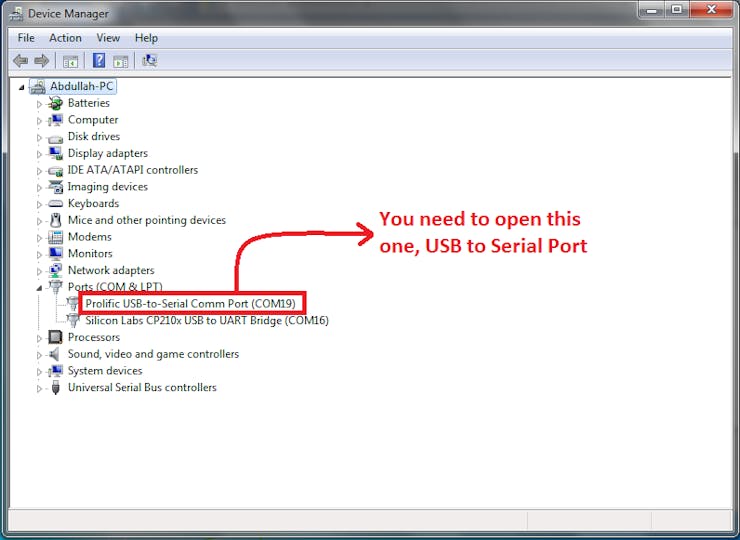 The other port COM 16, is a debug port available because we are using a USB type B cable to power the evaluation board; we don't need to use it now.