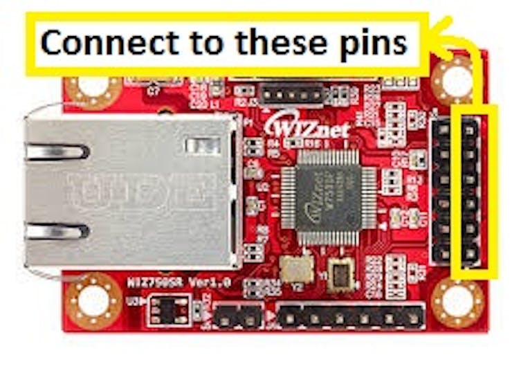 Then you can proceed to connect the WIZ750SR. This row has all all the pins you need to connect to your Arduino: