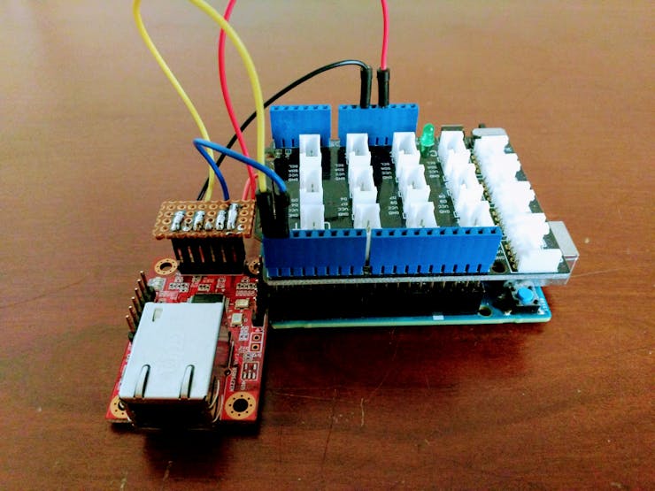- The Grove Temperature Sensor (I have v1.2) doesn't give the proper temperature when the base shield's voltage switch is at 5v, but the values are reasonable when it is at 3.3v. Therefore, I just connected it directly to the 3.3v supply of the Arduino 101 (Hence the two wires for Vcc from the WIZ750SR).