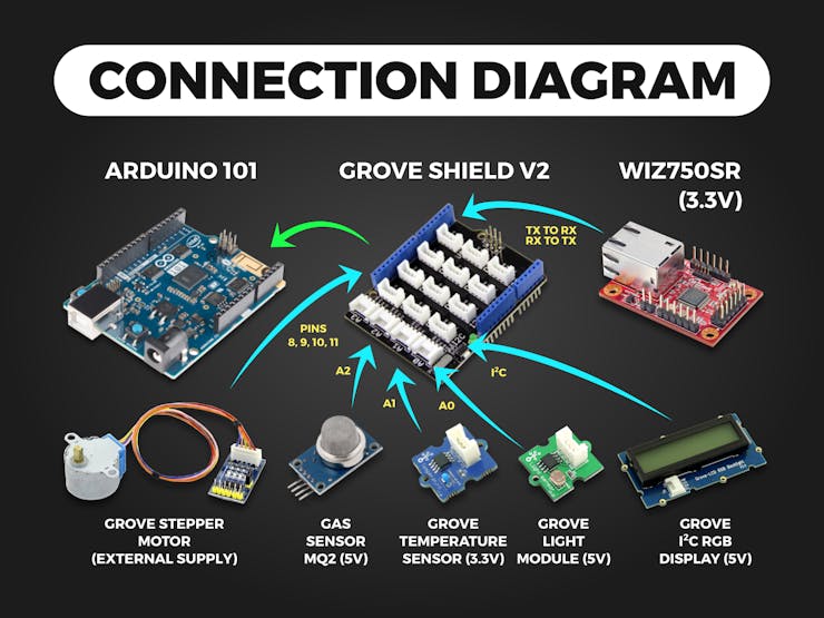 - I made the circuit such that I plugged in the Grove modules to the base shield itself, but used a separate 5v DC adaptor to power up the stepper motor, as well as the MQ2 gas sensor. This was done so that I could easily change the stepper motor with something more powerful and use another stepper motor driver, and also I didn't want to damage the Arduino 101 by drawing more current than it can handle. This is why I will not give you the diagram of how to connect but you must figure out the voltages for your setup yourself.