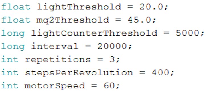 The interval is in milliseconds, and the lightThreshold is less on purpose, so that you can check it easily. You will need to change it to something which suits your setup. Also adjust the mq2threshold if you want.