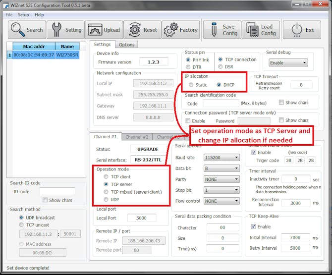 You will also need to re-configure the WIZ750SR to work as a TCP Server. To do that, plug it in the evaluation board and connect it with your PC (exactly as described previously), and open the WIZ750SR configuration tool. Configure it depending upon your setup; you need to set it as TCP server and set the local IP to static or DHCP. I will be using DHCP. Don't forget to click the Setting button after configuration is complete, and wait for the configuration complete message.