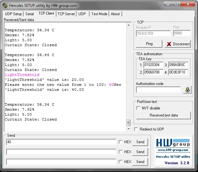 - Once closed, the code will wait until successive light reading above the light threshold are available, and it will send a command to open the curtain, and so on.