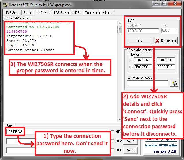 Once set up, using the same TCP Server code, connect everything according to the connection diagram. Open Hercules and enter IP and port, when you try to connect it will connect and then disconnect after a brief moment. This is because it is not receiving the proper password. This is how it looks: