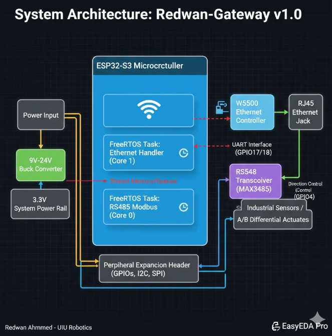 In many IoT prototypes, development starts with firmware or cloud dashboards. That approach works for demos, but it often breaks down in real deployments where power quality, cable length, electrical noise, and deterministic communication matter more than raw feature count. In the original project, Redwan Ahmmed positions the ESP32-Gateway v1.0 as a professional hardware foundation for industrial IoT, combining an ESP32-S3, a W5500 Ethernet controller, RS485/Modbus connectivity, and a 9V–24V wide-input power stage into a single gateway board. He also describes the firmware direction as a non-blocking FreeRTOS design so that network and field-bus communication can operate concurrently.