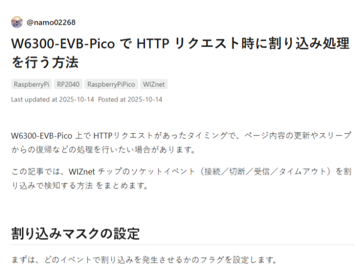 This article describes how to enable and handle interrupt-driven events on the W6300-EVB-Pico board to respond to HTTP requests. Rather than polling sockets continuously, the author shows how to configure WIZnet chip and RP2040 GPIO interrupts so that specific socket events (connect, disconnect, receive, timeout) trigger a callback routine. This allows more efficient handling of network events, page updates, or waking from sleep states when HTTP requests arrive.