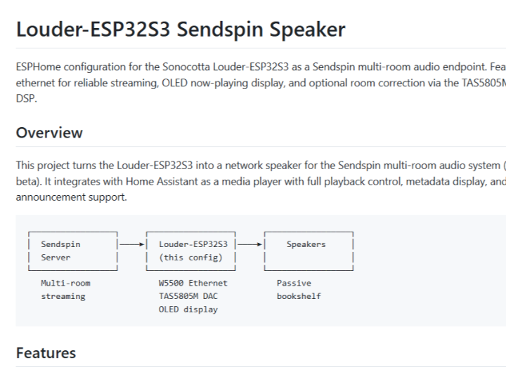 This project turns the Louder-ESP32S3 into a network speaker for the Sendspin multi-room audio system (ESPHome beta). It integrates with Home Assistant as a media player with full playback control, metadata display, and announcement support.