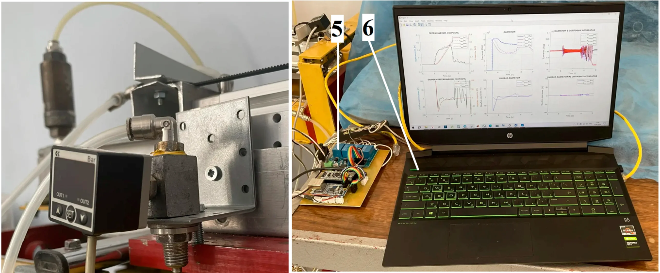1—에너지 하위 시스템; 2—구동 제어 장치; 3—로더의 장거리 이동을 위한 주 공압 실린더; 4—제트 센서 및 외부 제동 장치 형태의 제어 시스템; 5—전기 하위 시스템; 6—개인용 컴퓨터.