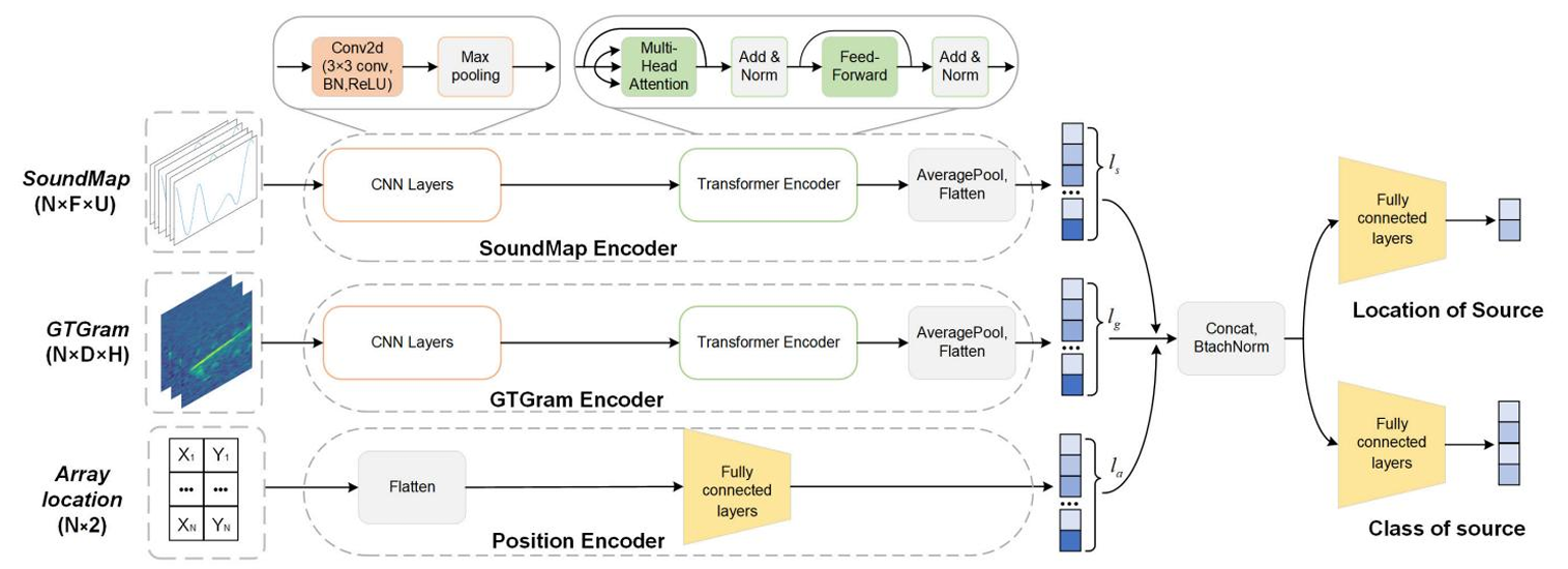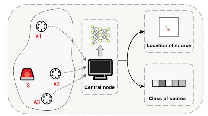 A central node aggregates feature data from multiple array nodes and feeds them into a CNN + Transformer-based multitask neural network. The network jointly predicts the sound class (e.g., siren, scream, gunshot, or background noise) and the 2D coordinates of the sound source. Experimental results show state-of-the-art performance in both simulated and real outdoor environments, with localization RMSE as low as a few meters in complex noise scenarios .