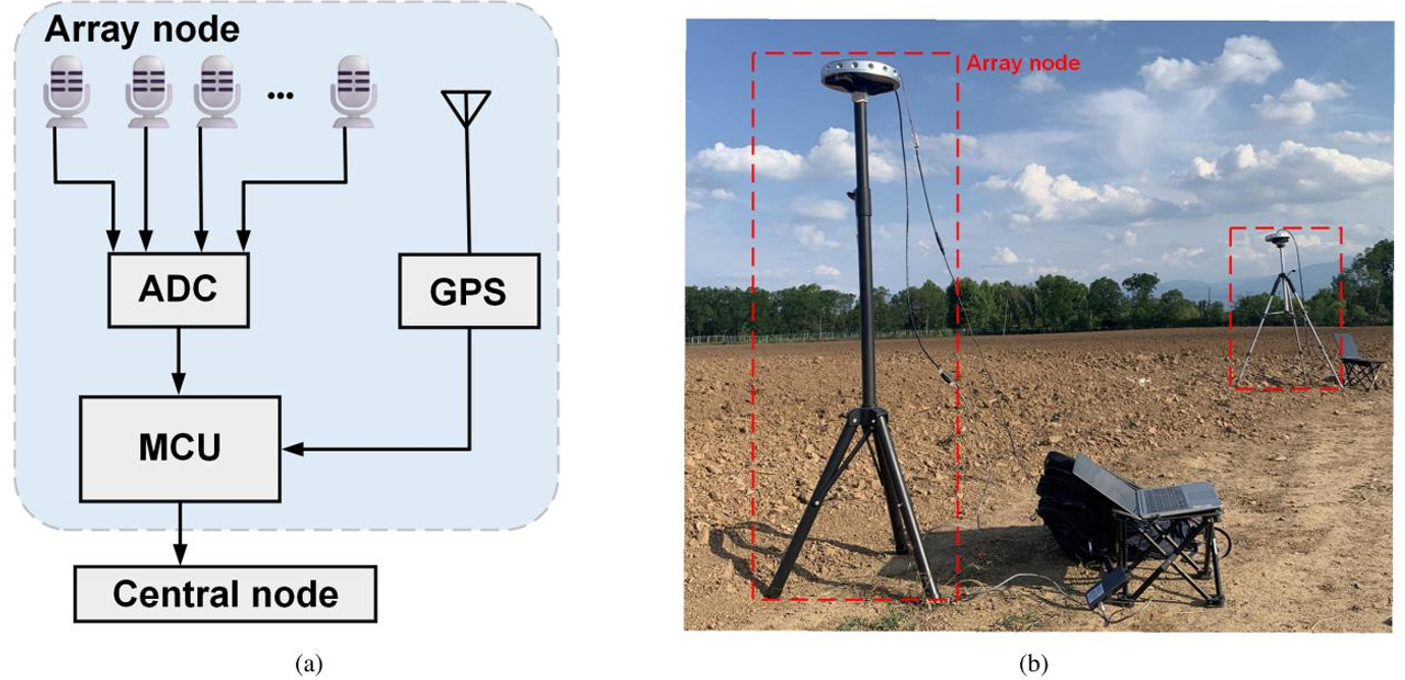 Each sensing unit, referred to as an array node, is equipped with an eight-channel circular microphone array. Instead of streaming raw audio, which would be bandwidth-intensive and sensitive to packet loss, each node performs local signal processing. This includes broadband beamforming to generate SoundMap features and perceptually motivated GTGram (Gammatone-based spectrogram) features. These features capture spatial, temporal, and frequency-domain information required for downstream inference.