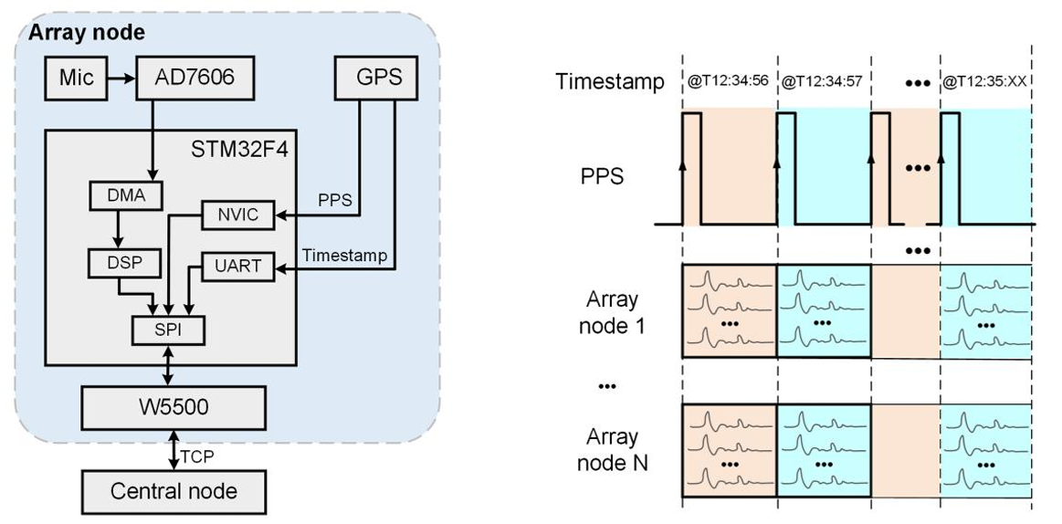 The paper explicitly documents the hardware architecture of each array node. At its core is an STM32F4 microcontroller (ARM Cortex-M4, up to 168 MHz, FPU enabled). Audio signals are digitized using an external AD7606 multi-channel ADC, and precise time alignment across nodes is achieved using GPS modules providing PPS (Pulse-Per-Second) signals.