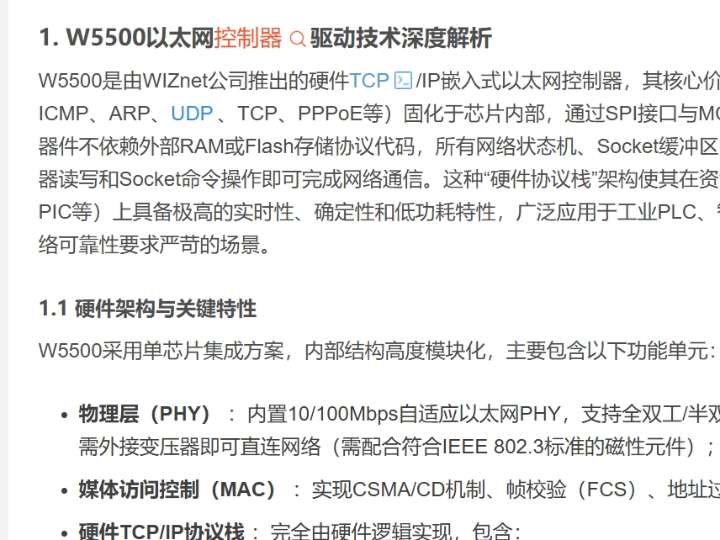 Original article: CSDN post, “W5500以太网控制器驱动技术深度解析,” published in 2026. The visible page presents a detailed architecture and register-level explanation of the W5500, including common registers, socket registers, buffer layout, interrupt model, and hardware TCP/IP behavior.